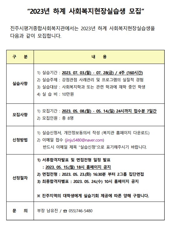 230509_평거종합사회복지관 하계 실습생 모집 안내