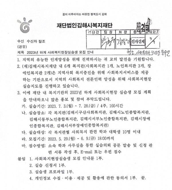 230517_재단법인김해시복지재단 하계 실습생 모집 안내