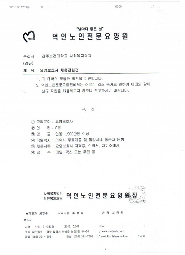 덕인노인전문요양원 채용공고(밀양)