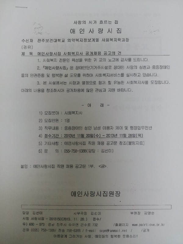 52655) 경상남도 진주시 의병로 51 진주보건대학교 사회복지과 TEL : 055-740-1880, 1881